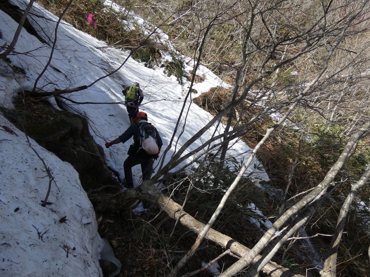 下見当日の湯川渓谷、スキー場から入った直後から道に雪解け水、金剛水手前で既に登山道に残雪。丸札7番の「雪の回廊」上は、7割方雪道。13番の「三階滝分岐」から上は 滑ったら沢まで止まりようがない状況。屏風岩でそれ以上の偵察を断念、昼食を摂って下山した。塩沢スキー場「全面にカタクリ」とは行かないが、携帯電話塔の当たりは足の踏み場ないくらい咲いて居た。今週末当たりはスキー場前面に広がる予感。